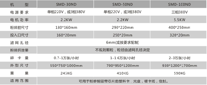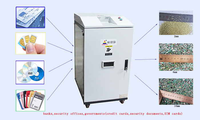 本系列碎卡機,針對銀行系統的卡處理中心,為批量銷毀處理報廢的銀行卡、信用卡而設計,每小時的銀行卡處理量可達到700-30000張,且設備體型小、噪音小,移動方便,用電靈活。